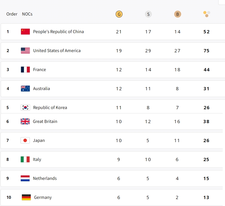 Tính đến 21 giờ 15 phút ngày 5-8 (theo giờ Việt Nam), Đoàn thể thao Trung Quốc dẫn đầu với 21 HCV, 17 HCB, 14 HCĐ. Xếp thứ hai là Mỹ với 19 HCV, 29 HCB, 27 HCĐ; xếp thứ ba là chủ nhà Pháp với 12 HCV, 14 HCB, 18 HCĐ.