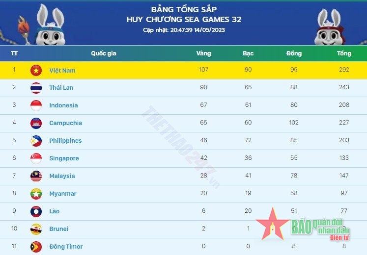 Bảng tổng sắp huy chương SEA Games 32 ngày 14-5 tính đến 20 giờ, đoàn thể thao Việt Nam vững vàng ngôi đầu với 107 HCV, 90 HCB và 95 HCĐ.
