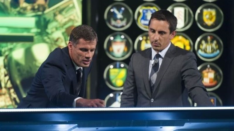 Jamie Carragher (bên trái) và Gary Neville, cựu hậu vệ Manchester United phân tích trong Chương trình “Monday Night Football” trên Sky Sports. Ảnh: Getty