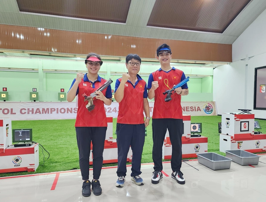 Xạ thủ Trịnh Thu Vinh và Phạm Quang Huy của đội tuyển bắn súng Việt Nam xuất sắc giành huy chương vàng 10m súng ngắn đôi nam nữ tại Giải bắn súng vô địch châu Á 2024, diễn ra tại Indonesia.
