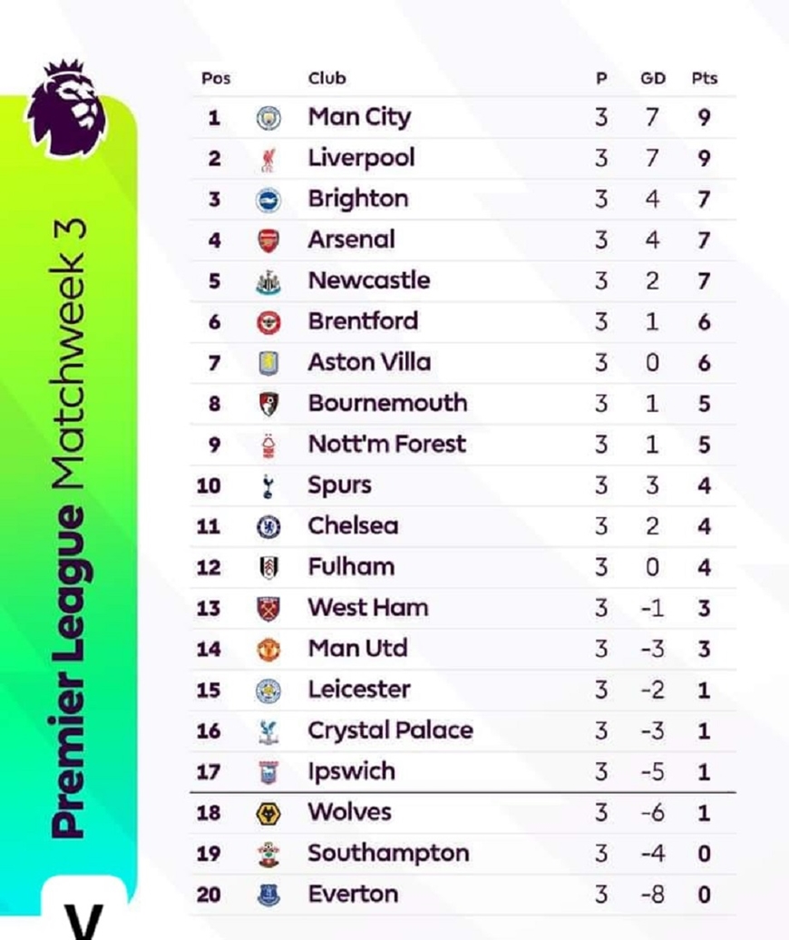 Bảng xếp hạng giải Ngoại hạng Anh 2024-2025 trước vòng 4. Ảnh: Premier League