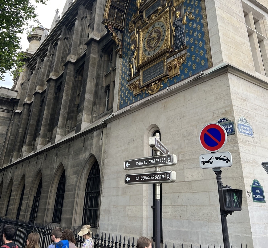 Góc đường nhộn nhịp người qua lại mỗi ngày, nhưng không nhiều người để ý tới chiếc đồng hồ này, khác với đoàn người lũ lượt ngắm tháp Eiffel. Thời Vua Charles V, nơi đây được gọi là tháp đồng hồ Conciergerie, cao 47m, dùng làm vọng gác, canh cung điện. Sau này vào thời Cách mạng Pháp, khu vực này được dùng làm nhà tù giam giữ những nhân vật nổi tiếng trước khi đưa đi tử hình. Chiếc đồng hồ này được làm bởi nghệ nhân Henri de Vic, trải qua hàng trăm năm, nó được các đời vua cải tạo, trang trí thêm để tạo nên một tác phẩm nghệ thuật thực sự. Chiếc đồng hồ có đường kính 1,5m, hầu hết được mạ vàng với các hình thiên thần.