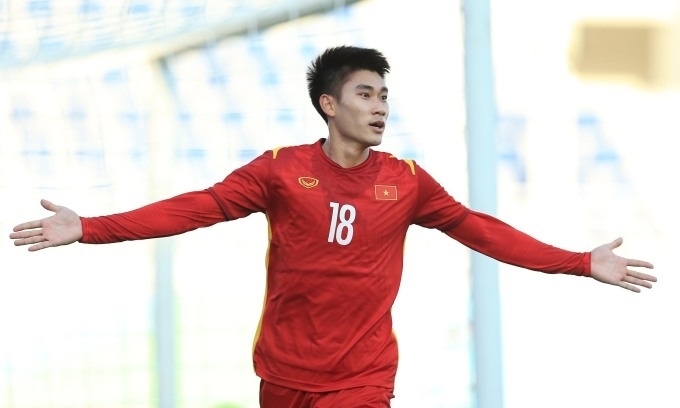 Hữu Thắng ăn mừng bàn mở tỷ số. Ảnh Hoàng Linh