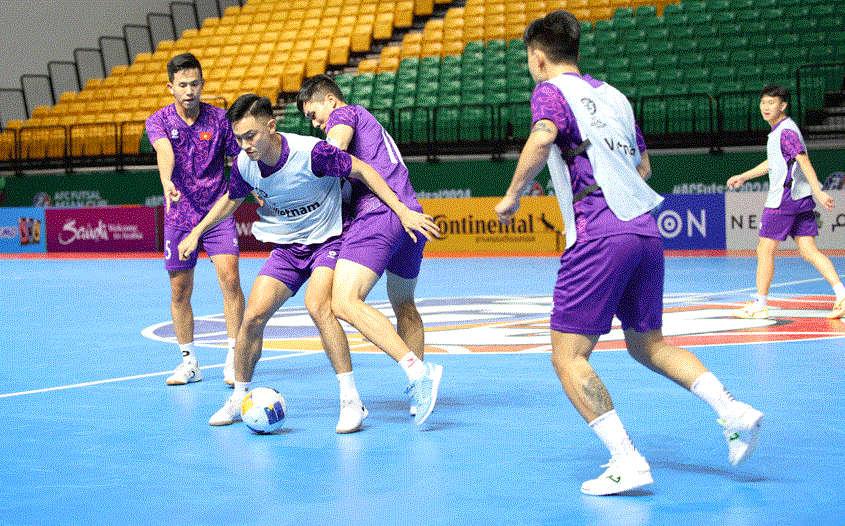 Đội tuyển futsal Việt Nam làm quen nhà thi đấu trước tứ kết. Ảnh: VFF