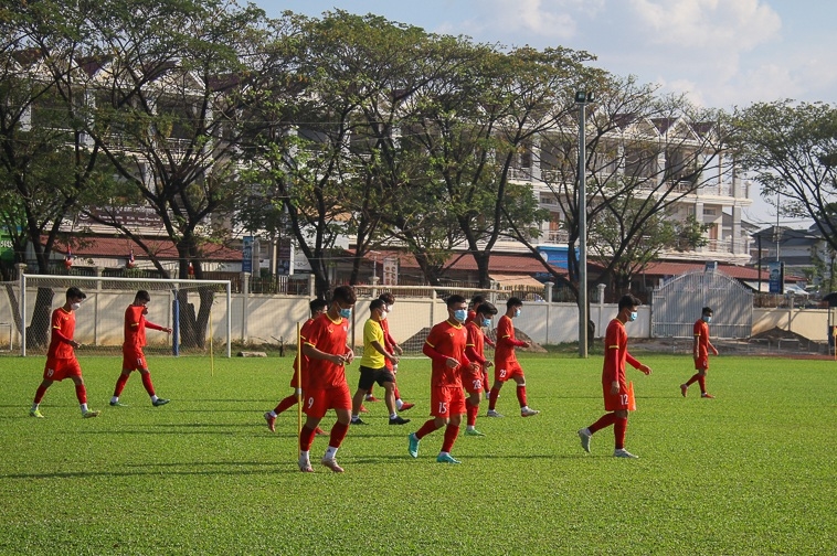 Các cầu thủ Việt Nam khởi động trước trận bóng. Ảnh: LÂM THỎA