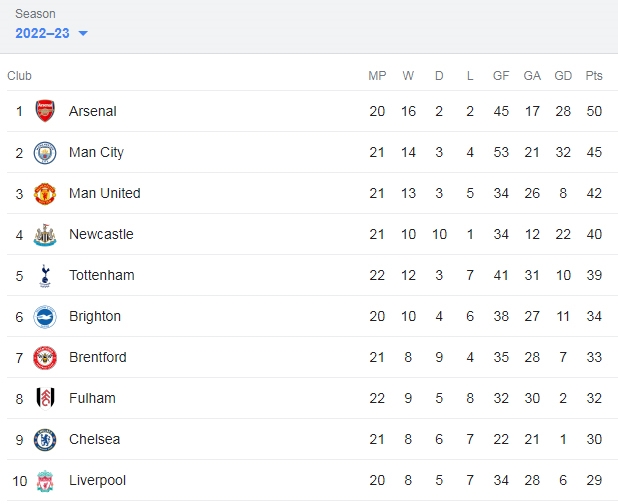 Tại vòng 22 Ngoại hạng Anh, bất ngờ lớn nhất chính là việc Arsenal phải nhận thất bại với tỷ số tối thiểu khi đến làm khách của Everton. Dù vậy, “Pháo thủ” vẫn duy trì được ngôi đầu trên bảng xếp hạng với 50 điểm trong tay.