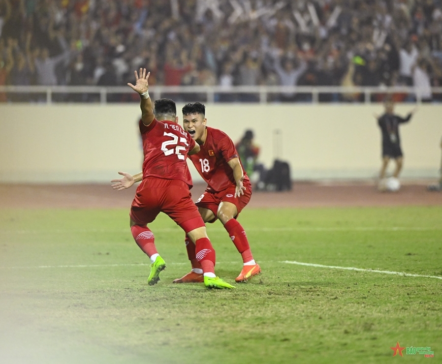 Các cầu thủ Việt Nam ăn mừng sau bàn gỡ của Tiến Linh. Ảnh: ESPN.