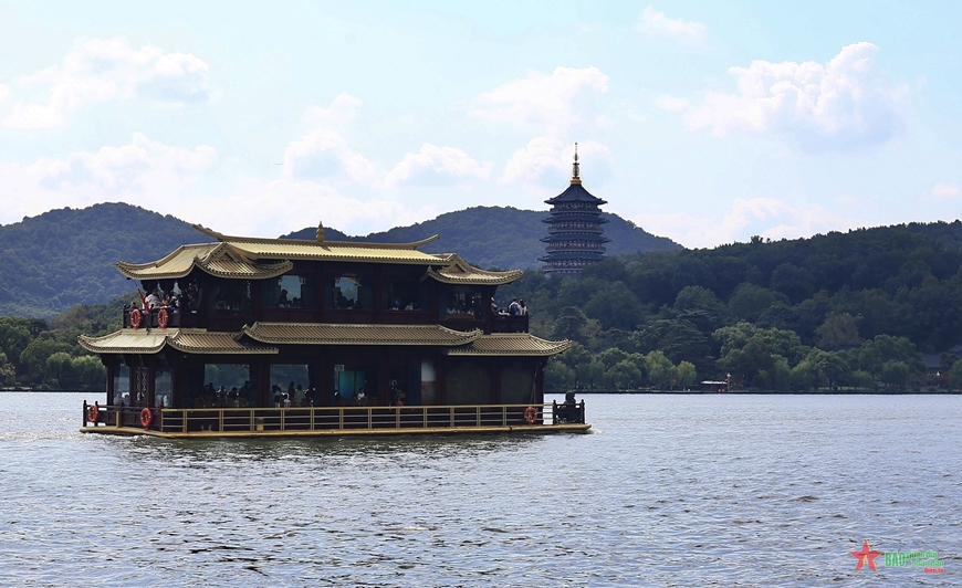 Giữa trời thu mát mẻ, đi thuyền giữa Tây Hồ gợi cảm giác của một thi sĩ ngao du sơn thuỷ. Bên trái là ngôi chùa bát giác ẩn hiện chính là Lôi Phong tịch chiếu. Xa xa, một Hàng Châu hiện đại với những tòa nhà cao tầng, hòa chung với phong cảnh lãng mạn nên thơ.