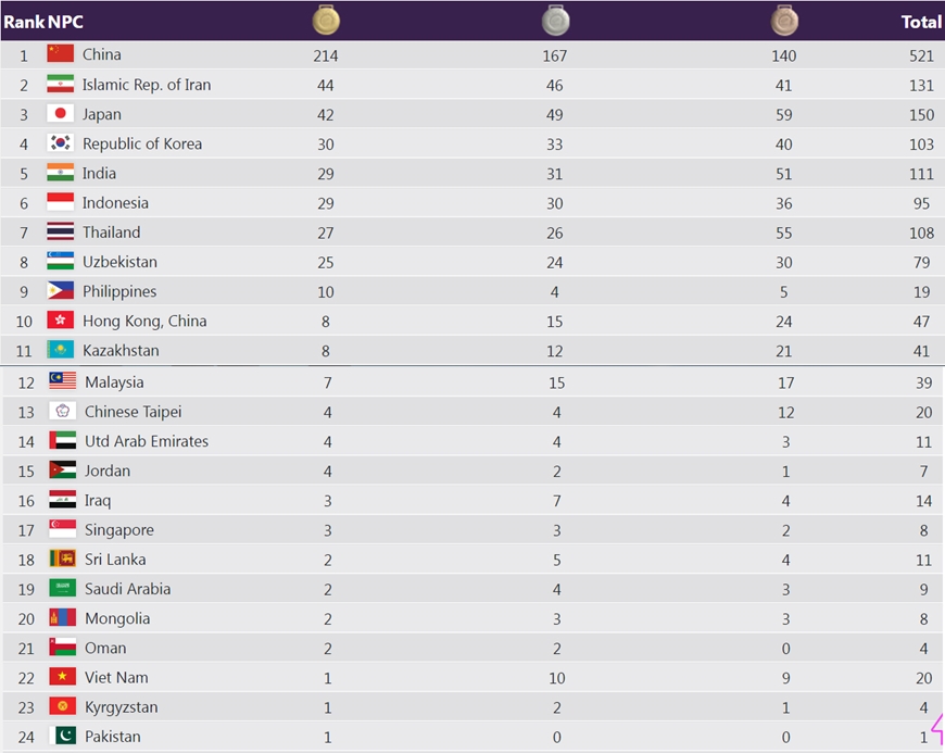 Bảng tổng sắp huy chương Asian Para Games 4 chung cuộc. Ảnh: Hangzhou2022