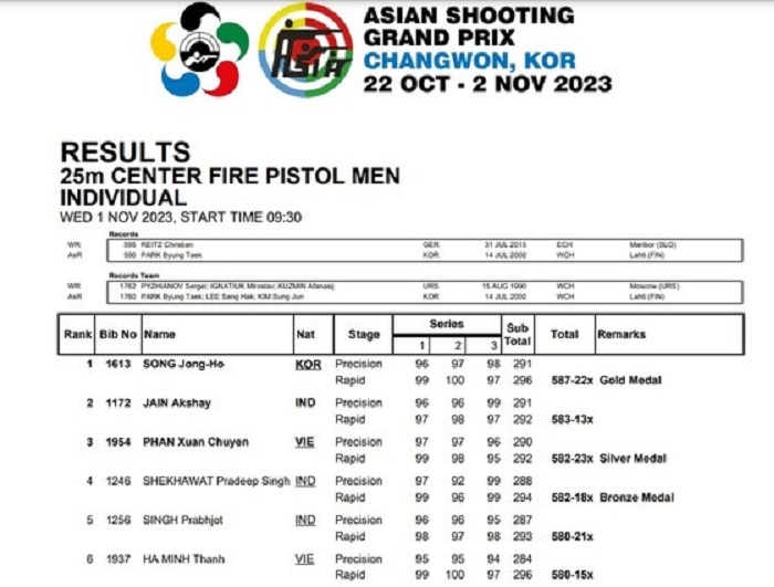 Ngày 1-11, đội tuyển bắn súng Việt Nam bước vào ngày tranh tài cuối cùng tại Giải bắn súng vô địch châu Á 2023. Trong bài bắn cá nhân, xạ thủ Phan Xuân Chuyên đã thi đấu xuất sắc để giành huy chương bạc. Xạ thủ Phan Xuân Chuyên đã đạt 582 điểm sau hai bài bắn tiêu chuẩn và bắn nhanh. Xạ thủ Song Jong-Ho của Hàn Quốc giành huy chương vàng với 587 điểm.