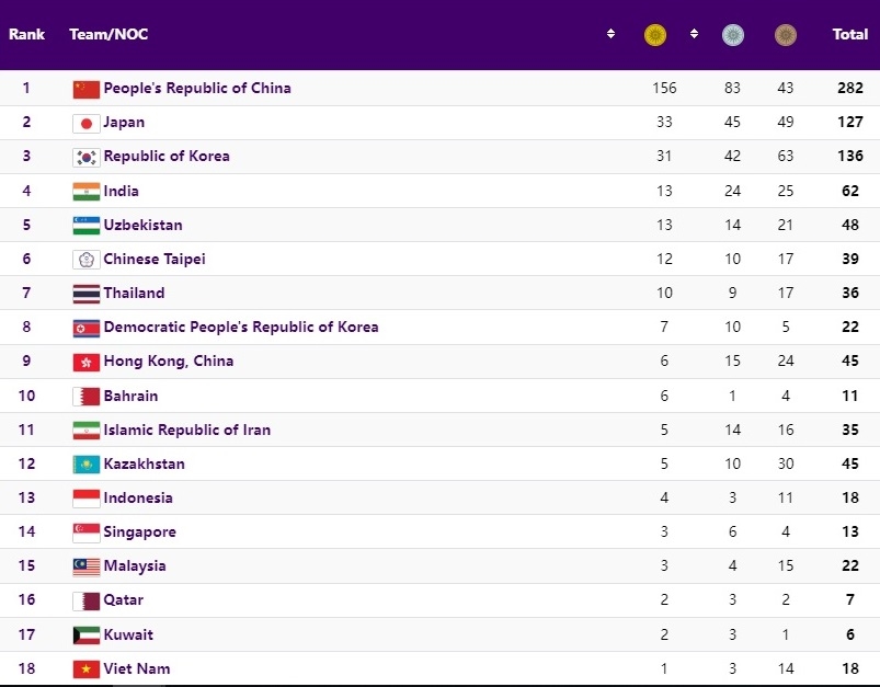 Cập nhật bảng tổng sắp huy chương ASIAD 19 hôm nay, tính đến 17 giờ 30 phút ngày 3-10, Đoàn thể thao Trung Quốc tiếp tục khẳng định sức mạnh vượt trội với 156 huy chương vàng, 83 huy chương bạc và 43 huy chương đồng. Đoàn thể thao Việt Nam đang xếp thứ 18 trên bảng tổng sắp huy chương với 1 huy chương vàng, 3 huy chương bạc, 14 huy chương đồng.