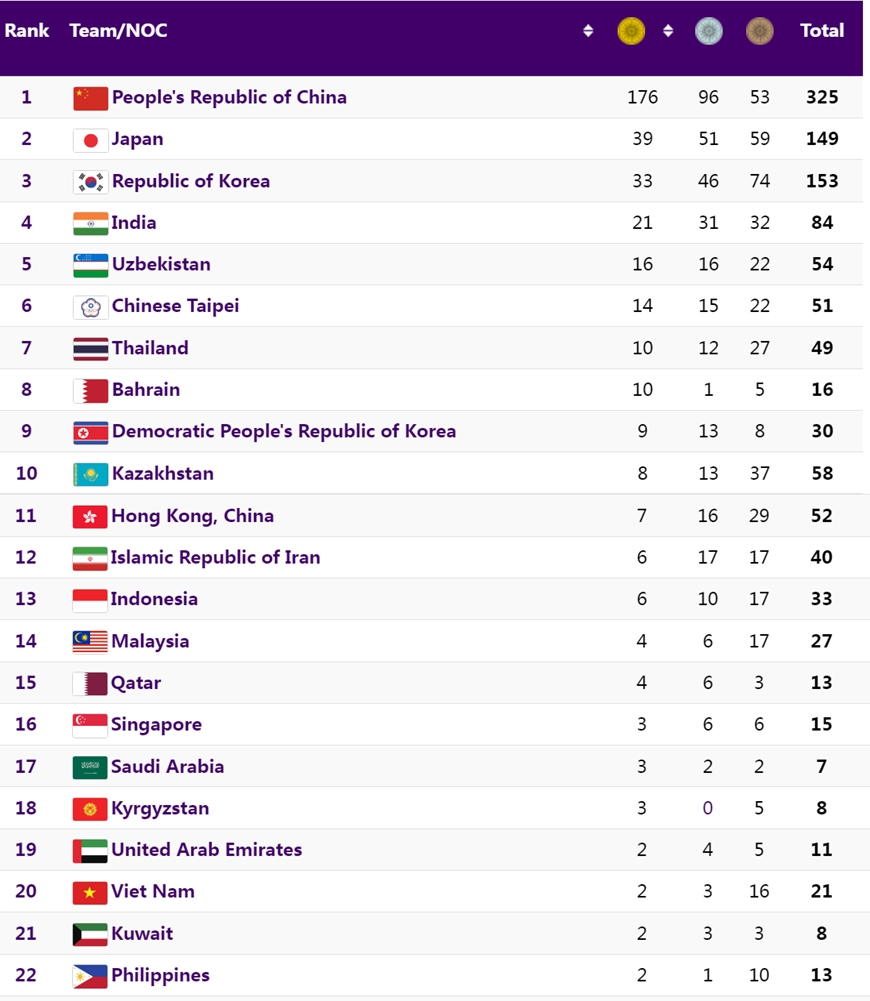 Bảng tổng sắp huy chương ASIAD 19 hôm nay 5-10 tính đến 17 giờ 30 phút. Ảnh: hangzhou2022