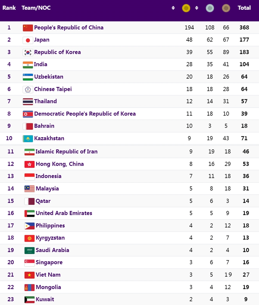 Bảng tổng sắp huy chương ASIAD 19 hôm nay tính đến 17 giờ 30 phút ngày 7-10. Ảnh: hangzhou2022