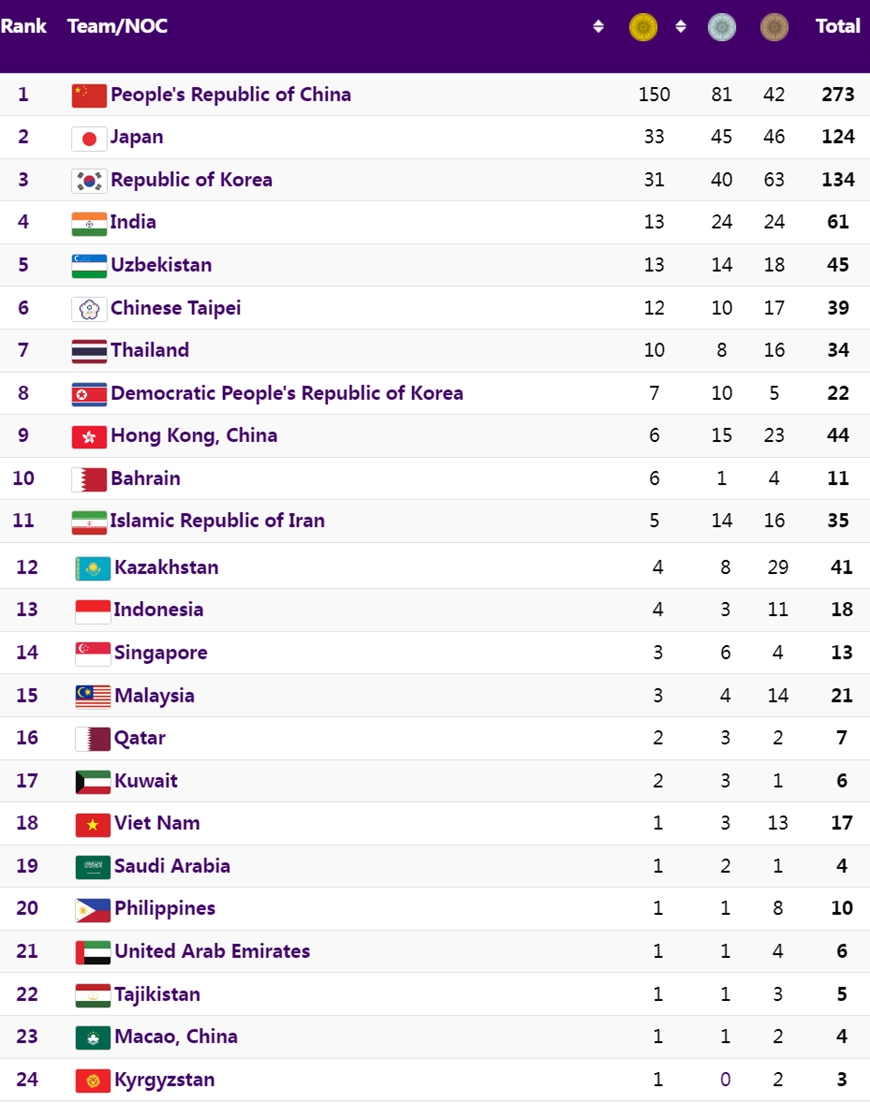 Cập nhật bảng tổng sắp huy chương ASIAD 19 sáng nay ngày 3-10 tính đến 11 giờ, đoàn chủ nhà Trung Quốc đã cán mốc 150 huy chương vàng.