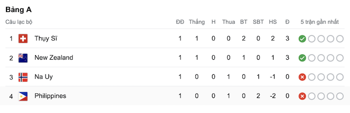 Mặc dù bằng điểm với đội đồng chủ nhà New Zealand nhưng Thụy Sĩ vẫn xếp trên nhờ hơn chỉ số phụ. Nguồn: Google News