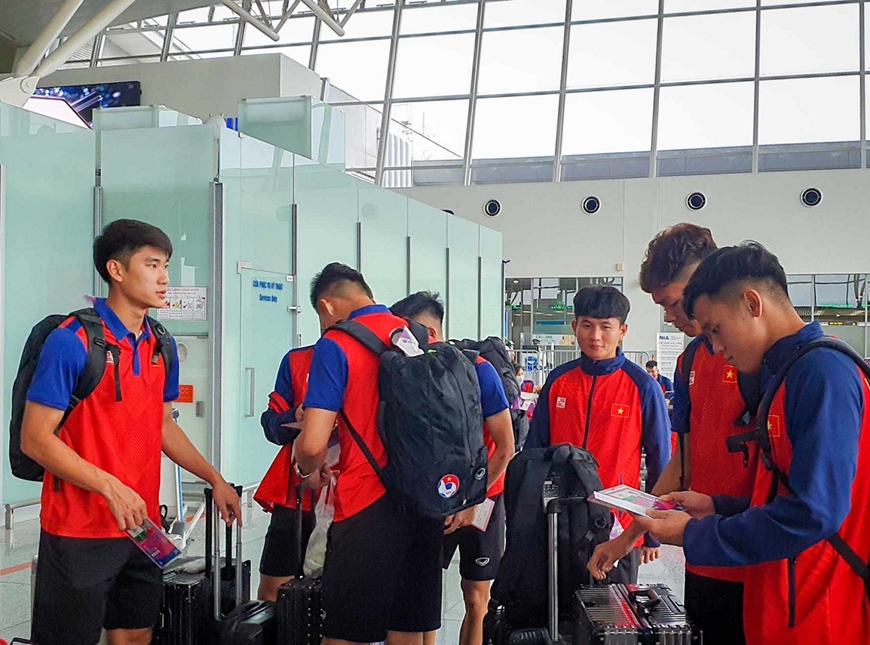 Các cầu thủ làm thủ tục trước khi lên máy bay. Ảnh: VFF