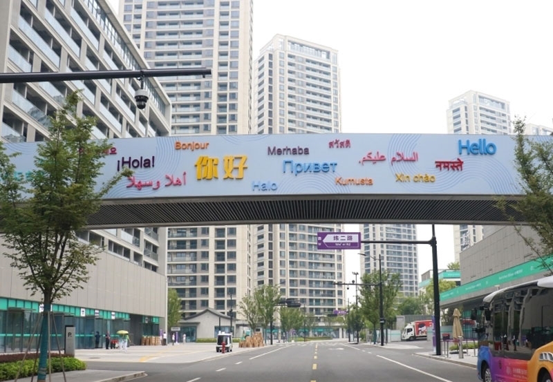 Cầu “Xin chào” trong Làng Đại hội được viết bằng nhiều thứ tiếng, trong đó có tiếng Việt.