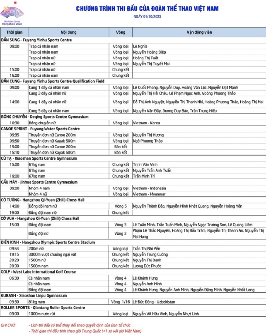 Trong ngày 1-10, Đoàn thể thao Việt Nam tranh tài ở 12 môn thi đấu gồm bắn súng, bắn cung, bóng chuyền, canoe sprint, cờ tướng, cờ vua, cử tạ, điền kinh, cầu mây, golf, kurash và roller sports.