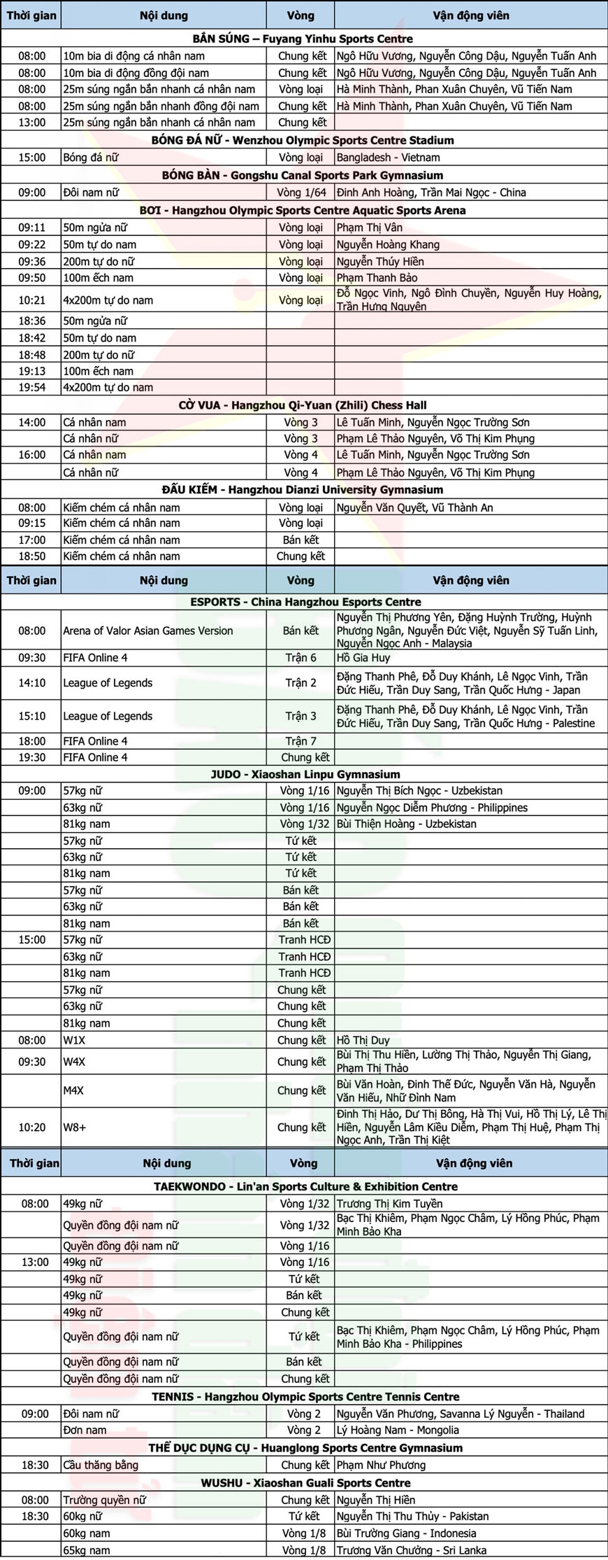 Lịch thi đấu ASIAD 19 hôm nay (25-9)