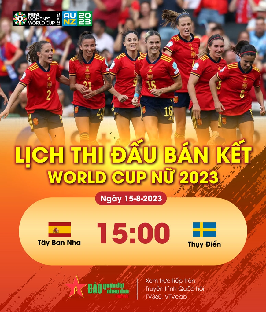 World Cup nữ 2023 đã xác định 4 đội vào bán kết là Anh, Tây Ban Nha, Thụy Điển và Australia. Theo lịch thi đấu, Tây Ban Nha sẽ gặp Thụy Điển vào lúc 15 giờ chiều 15-8, Australia chạm trán Anh lúc 17 giờ chiều 16-8. Hai trận đấu này đều được trực tiếp trên Truyền hình Quốc hội, TV360 và VTVcab.