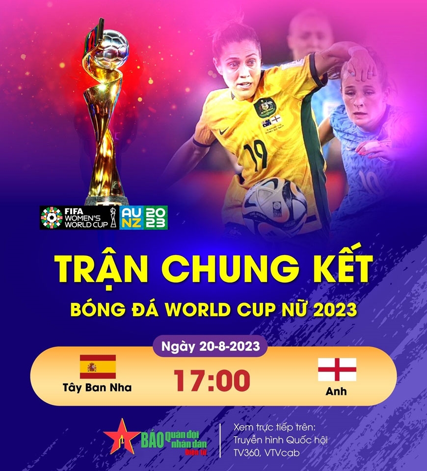 Cập nhật lịch trực tiếp, lịch thi đấu chung kết World Cup nữ 2023 mới nhất giữa Tây Ban Nha và Anh, diễn ra lúc 17 giờ chiều ngày 20-8.