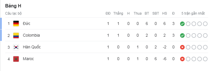 Bảng xếp hạng bảng H trước loạt trận thứ hai.