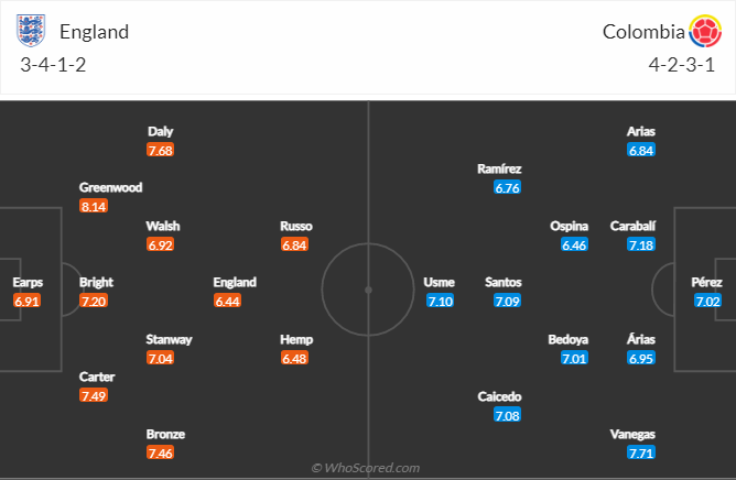 Đội hình dự kiến trận Anh và Colombia. Ảnh: Whoscored.com