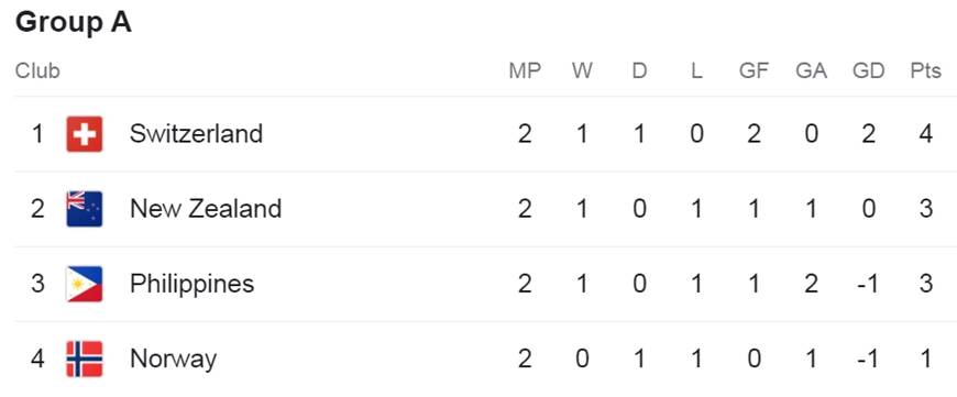Hiện tại, ở bảng A, nữ Thụy Sĩ đang dẫn đầu với 4 điểm. New Zealand đứng thứ hai với 3 điểm kèm theo hiệu số 1-1. Philippines xếp thứ ba khi cũng có 3 điểm nhưng hiệu số 1-2. Na Uy đứng cuối bảng nhưng vẫn có cơ hội đi tiếp.