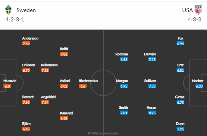 Đội hình dự kiến trận Mỹ và Thụy Điển. Ảnh: Whoscored.com