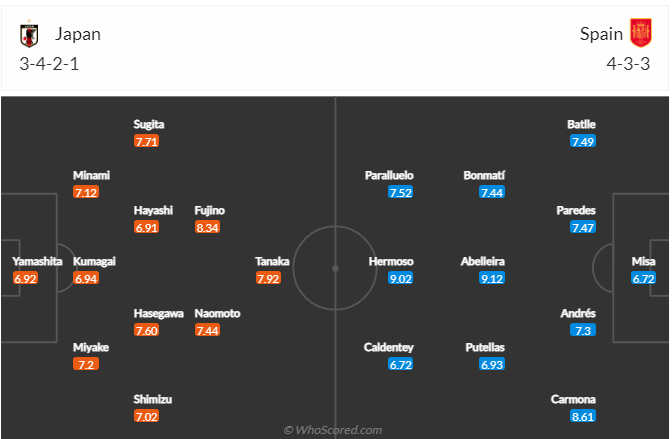 Đội hình dự kiến trận Nhật Bản và Tây Ban Nha. Ảnh: Whoscored