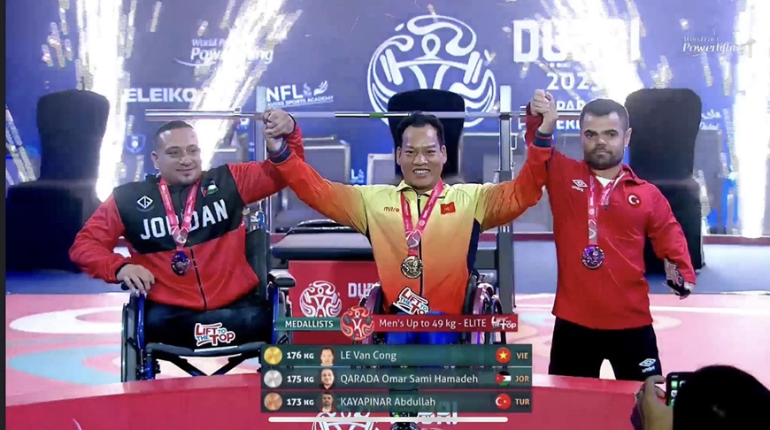 Lê Văn Công giành huy chương vàng hạng 49kg nam tại Giải cử tạ người khuyết tật vô địch thế giới 2023 diễn ra ngày 23-8, tại Saudi Arabia.