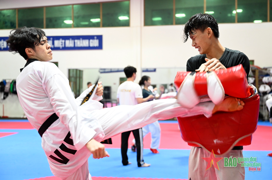 Các tuyển thủ taekwondo Việt Nam luyện đòn đá. Ảnh: VIỆT TRUNG