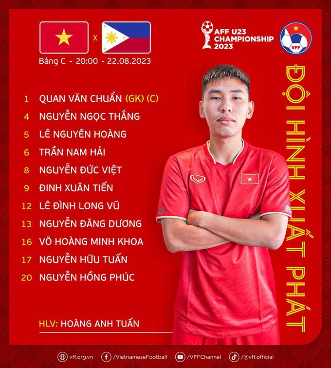 U23 Việt Nam: Văn Chuẩn, Nguyên Hoàng, Ngọc Thắng, Nam Hải, Đức Việt, Xuân Tiến, Long Vũ, Đăng Dương, Minh Khoa, Hữu Tuấn, Hồng Phúc.