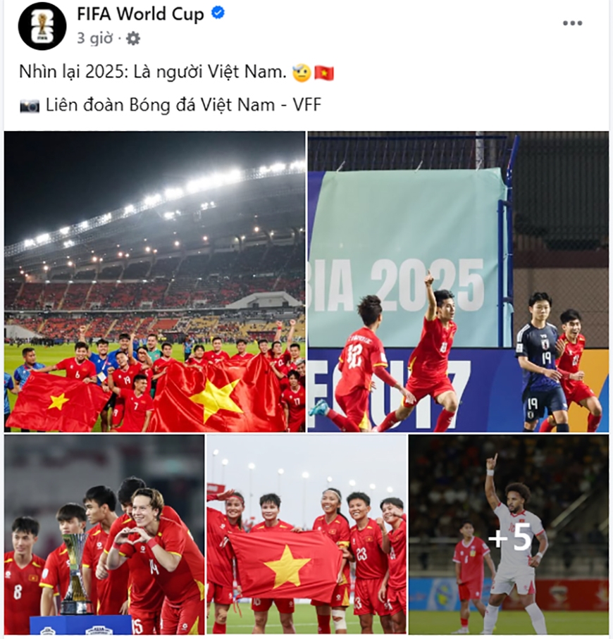 Trên fanpage chính thức, FIFA World Cup đăng tải loạt ảnh tiêu biểu của bóng đá Việt Nam kèm thông điệp ngắn gọn, ý nghĩa: “Nhìn lại 2025: Là người Việt Nam”.