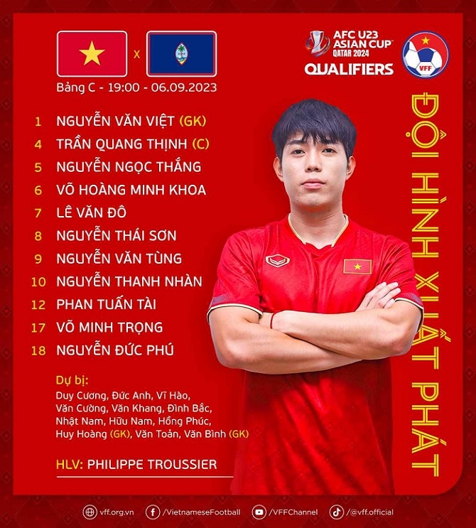 Link xem trực tiếp U23 Việt Nam và U23 Guam (Vòng loại U23 châu Á)Link xem trực tiếp U23 Việt Nam và U23 Guam trong khuôn khổ bảng C- Vòng loại U23 châu Á 2024, diễn ra lúc 19 giờ tối 6-9 trên sân Việt Trì (Phú Thọ).HLV Philippe Troussier chốt danh sách cầu thủ U23 Việt Nam dự Vòng loại U23 châu ÁTrưa 5-9, HLV Philippe Troussier đã chốt danh sách 23 cầu thủ U23 Việt Nam dự Vòng loại Giải U23 châu Á 2024 tại Việt Trì (Phú Thọ).Nhận định U23 Việt Nam và U23 Guam tại vòng loại U23 châu Á 2024Nhận định U23 Việt Nam và U23 Guam diễn ra lúc 19 giờ tối 6-9 tại trận ra quân bảng C Vòng loại Giải bóng đá U23 châu Á 2024.Đông đảo người hâm mộ mua vé xem U23 Việt Nam đá Vòng loại U23 châu Á Sáng 3-9, đông đảo người hâm mộ đã xếp hàng dài trước Nhà Luyện tập và Thi đấu thể dục, thể thao tỉnh Phú Thọ để mua vé xem các trận thi đấu của đội tuyển U23 Việt Nam, U23 Singapore, U23 Yemen và U23 Guam tại Vòng loại U23 châu Á 2024.