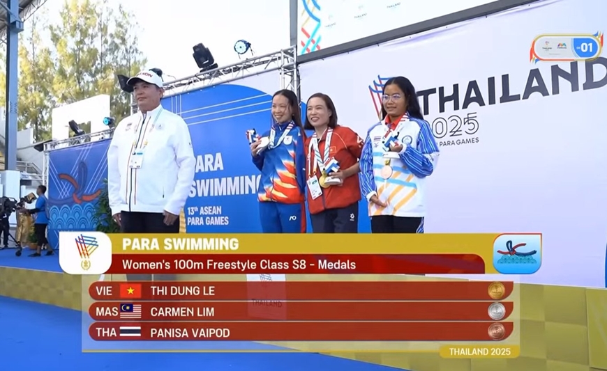 Nối tiếp đà thăng hoa, vận động viên Lê Thị Dung giành huy chương vàng thứ năm ở nội dung 100m tự do nữ hạng thương tật S8, với thành tích 1 phút 21 giây 25.
