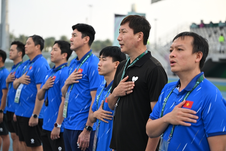 HLV Kim Sang-sik và ban huấn luyện tại lễ chào cờ Việt Nam ở trận U23 Việt Nam gặp U23 Kyrgyzstan. Ảnh: AFC