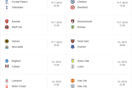 Thể thao/Quốc tế Chia sẻ Thứ năm, 26/10/2023 – 10:57Theo dõi Báo Quân đội nhân dân trên Lịch thi đấu vòng 10 Giải ngoại hạng Anh 2023-2024: Nóng derby Manchester Cập nhật lịch trực tiếp, lịch th...